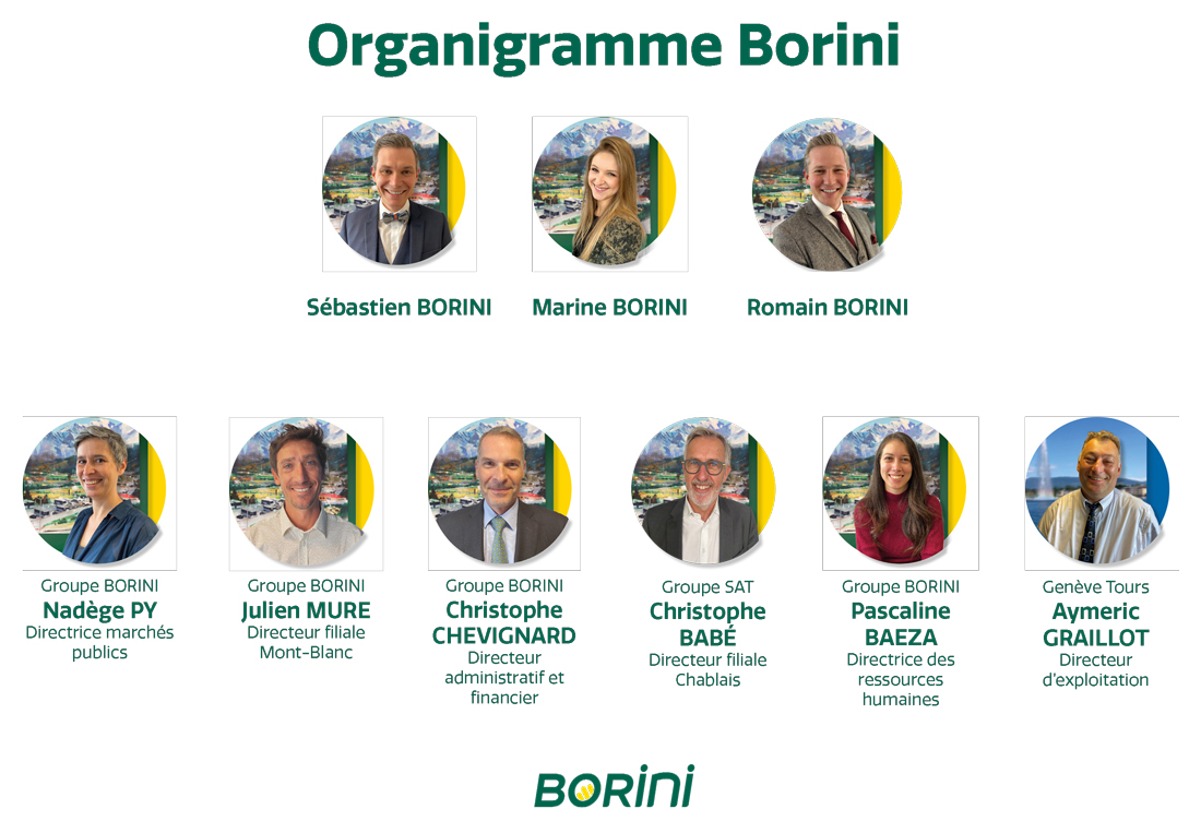 L’entreprise familiale BORINI, a été fondée en 1969 par Rémy et Auguste BORINI qui avaient pour vocation d’offrir un service de transport de proximité. C’est en octobre 1977 que Philippe rejoint son père et son oncle dans l’aventure familiale ! Pour des besoins de place, l’entreprise déménage de Megève à Demi-Quartier. Arrive ensuite Sébastien fils aîné de Philippe qui sera suivi de Romain son frère. Depuis ses débuts, l’entreprise est installée à Megève mais avec le développement de son activité, une structure plus grande est devenue nécessaire. Depuis 2014, l’entreprise est installée à Combloux dans un bâtiment respectueux de l’environnement qui peut accueillir tous les collaborateurs de la famille Borini Mont-Blanc ainsi que la majorité de la flotte. En 2020, Marine fille de Philippe et sœur de Sébastien et Romain a rejoint l’équipe.